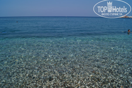 Отдыхали в июне 2025 года. Отель расположен на первой береговой линии, тихий, шумных компаний нет, детей почти тоже нет. Пляж галечный, камни крупные, вода в море чистая. Душ с пресной водой и туалет на пляже есть, из минусов очень плотно стоят лежаки, но всегда можно найти свободные места. Бар на пляже платный и с собой из отеля носить не разрешают. Полотенце пляжное нужно покупать 5 эвро/6 долларов, потом забираешь с собой и его не меняют.